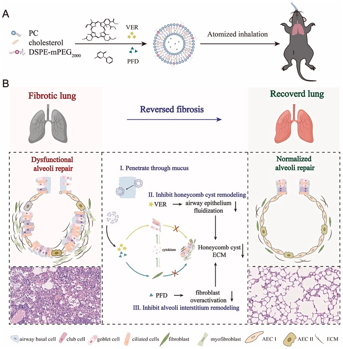 吸入納米制劑克服雙層屏障增強IPF治療示意圖