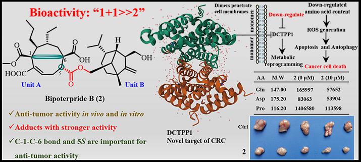 茜草是我國傳統常用中藥,具有重要藥用價值。該團隊綜合利用OSMAC、代謝組學和分子網絡可視化等技術從茜草內生真菌中分離得到系列具有新穎骨架的terpene-nonadride異源二聚體及其單體。其中化合物bipoterpride B具有較好的體內外抗結直腸癌(CRC)活性,優于臨床一線抗腫瘤藥物5-氟尿嘧啶和順鉑。進一步地,該團隊基于DARTS和蛋白質組學技術發現bipoterpride B的潛在作用靶標,并利用生物信息學技術、臨床樣本等發現DCTPP1是治療CRC的新靶標,同時證明bipoterpride B能夠通過靶向DCTPP1發揮抗結直腸癌活性。上述工作涵蓋了中藥化學/天然藥物化學研究的重要過程,包括化學分析、提取分離、結構鑒定、活性篩選、體內評價及靶標機制等方面研究,豐富了天然產物結構多樣性,為結直腸癌提供了新的治療靶標,同時還發現了首個靶向DCTPP1的抗結直腸癌天然抑制劑,為抗腫瘤藥物研究提供了潛在的候選分子。