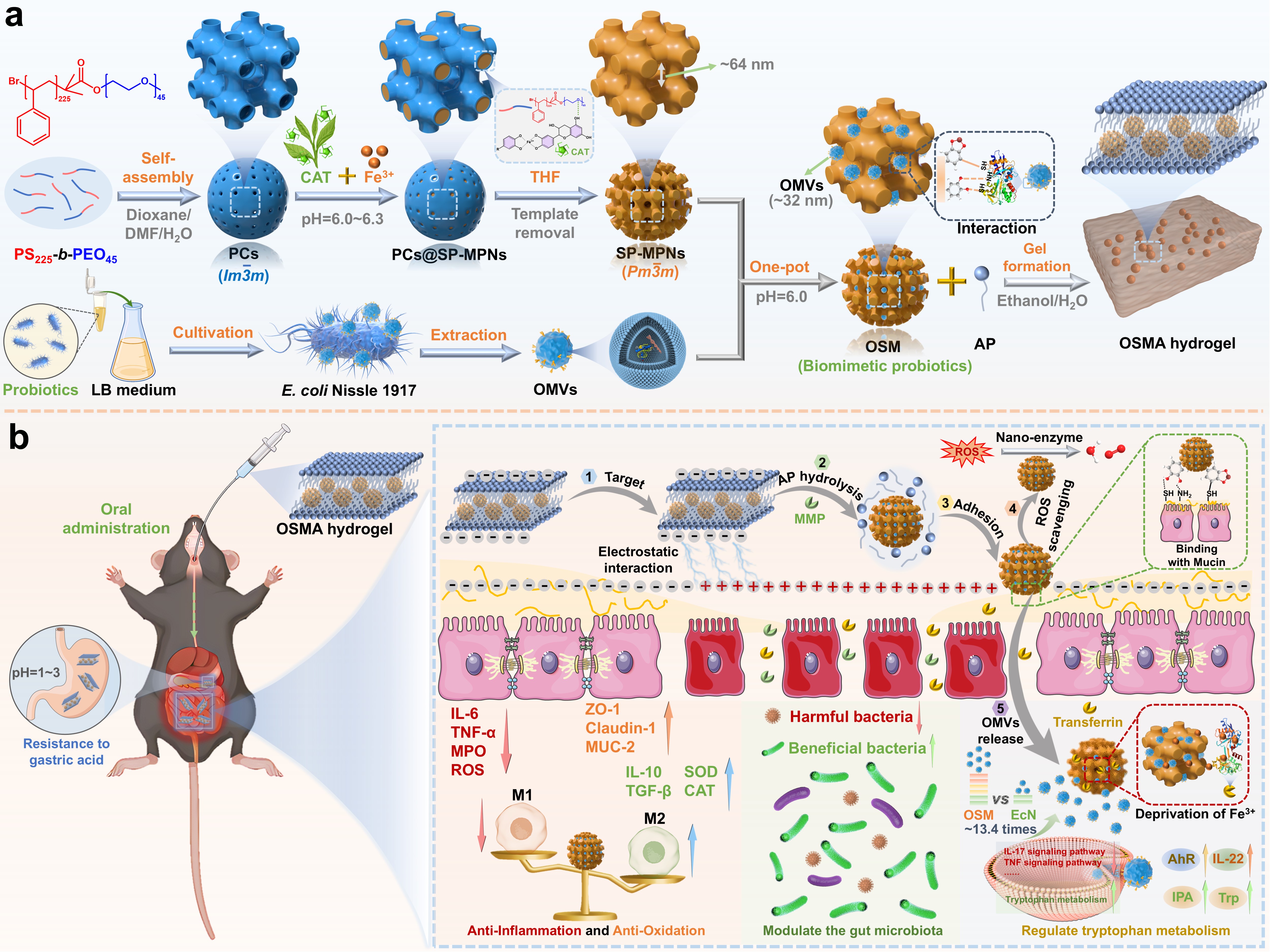 針對以上科學問題,研究團隊受益生菌自然分泌OMVs以及腸道定植行為的啟發,將益生菌OMVs負載于雙連續有序介孔金屬酚醛網絡(SP-MPNs)中構建仿生益生菌(OSM),進一步利用抗壞血酸棕櫚酸酯(AP)水凝膠對OSM進行保護并賦予其炎癥部位的精準靶向性。OSM到達炎癥部位后,一方面,OSM可以通過清除炎癥部位的ROS減緩氧化應激導致的腸屏障損傷,并且避免OMVs結構的破壞;另一方面,OSM響應炎癥部位過表達的轉鐵蛋白(Tf)緩慢釋放OMVs,發揮長效的抗炎及免疫調節效果。此外,OSM中的兒茶酚官能團可以與腸道粘液層中的粘蛋白產生相互作用,從而延長OSM在腸道中的停留時間,提高了OMVs的生物利用度。這項研究為UC等慢病的精準營養干預提供新思路。