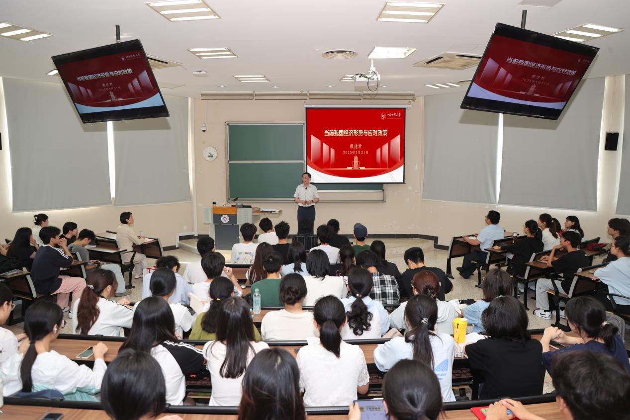 課堂上,戴建君以“什么是經濟”為切入點,圍繞2024年經濟建設成就、2025年經濟形勢、我國經濟面臨的機遇與挑戰、應對挑戰和解決經濟問題的方案等方面展開深入講解。他旁征博引,結合國內外形勢及中美貿易戰,細致梳理國家經濟政策與工作。尤其在分析今年經濟形勢時,他還深入結合生物醫藥產業發展和學校實際,突出穩就業、促發展的重要性。談及新發展理念、新發展格局及財政、貨幣政策時,他積極與學生互動交流,深入淺出的講解,讓在場學生對當前經濟形勢有了更為清晰的認識。